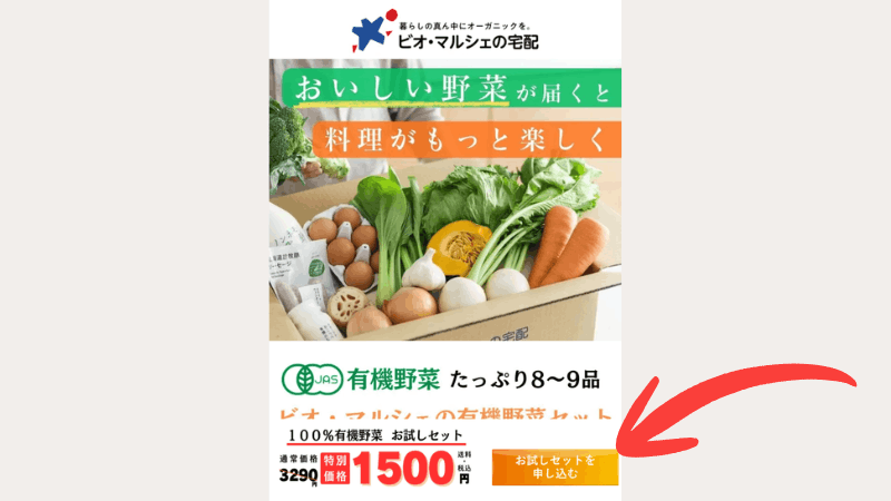 ビオマルシェのお試しセットは格安の1500円で試せるので、勧誘を気にせず気軽に体験してみてください。