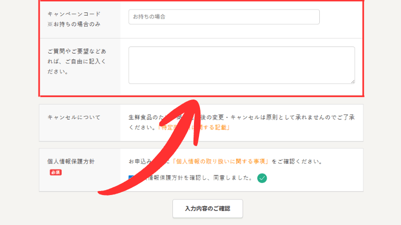 その後、キャンペーンコードを持っている方や質問がある方は、項目に入力していきます。