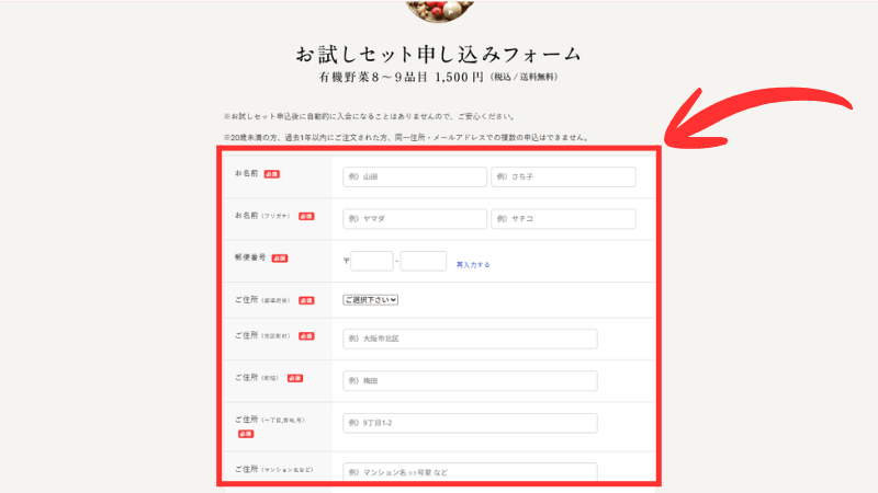 「お試しセット申し込みフォーム」では、お客様情報を入力していきます。