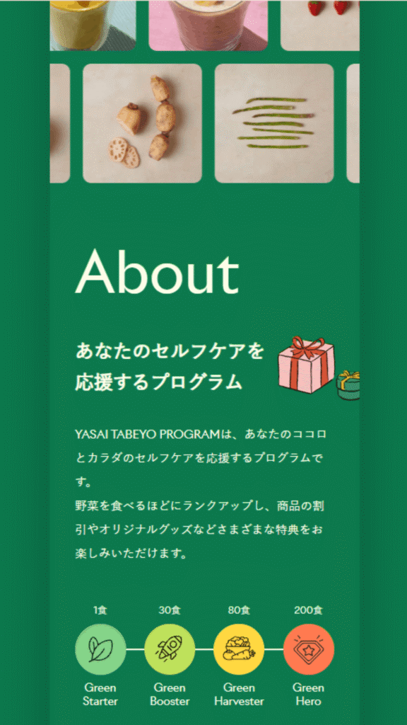 YASAI TABEYO PROGRAMは、グリーンスプーンの定期便を継続することでランクが上がり、特典が充実していく制度です。