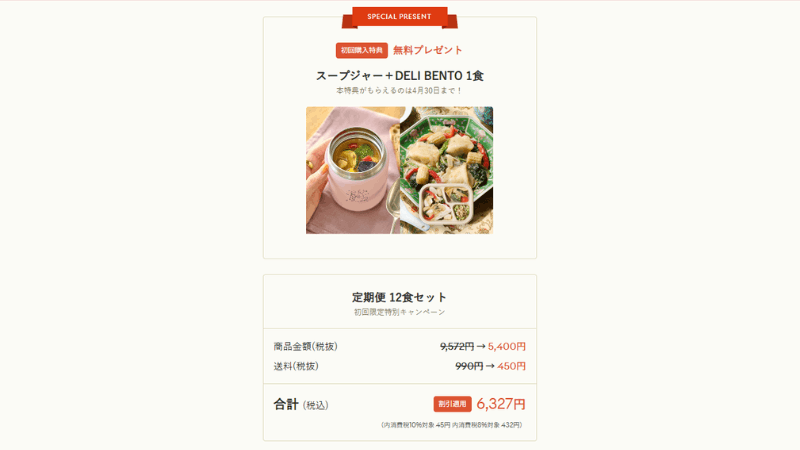 通常プランよりも割引が適用された価格でスタートできるほか、特典商品2食が無料でもらえるのでとってもお得!